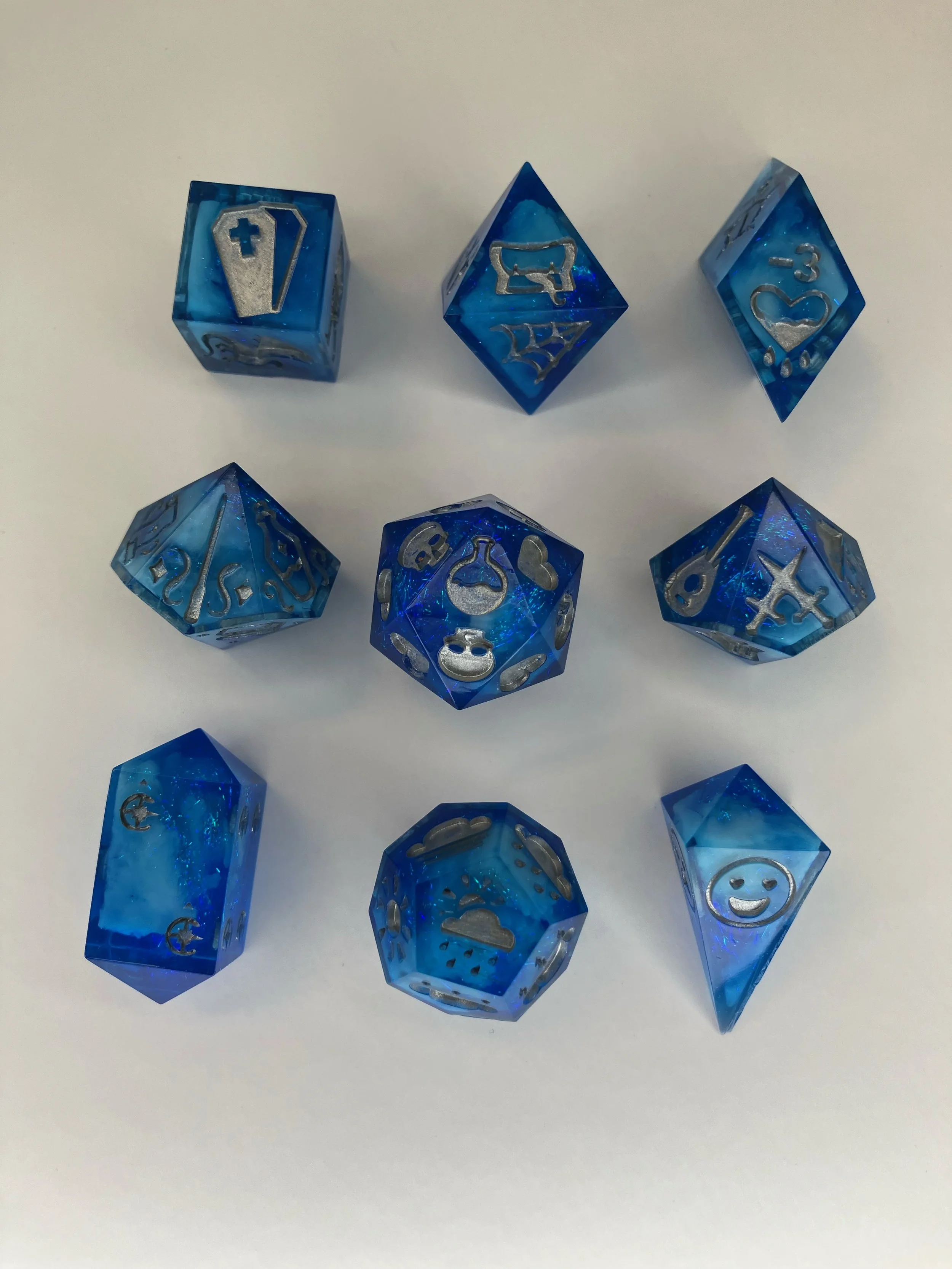 Disclaimer: Our dice are hand made and with that may have slight imperfections. We will mention anhy imperfections in the discription. We may miss something small but all of our dice are still useable at the table with friends and are stunning peices of art that can be displayed to all.